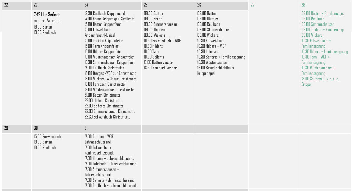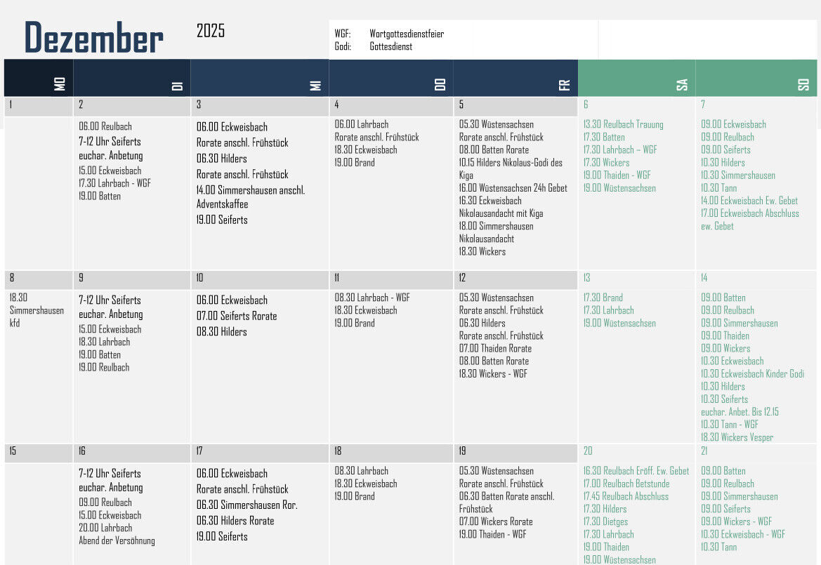 Der folgenden Aufstellung können Sie entnehmen, wann in den einzelnen Orten im Pastoralverbund Gottesdienste gefeiert werden.